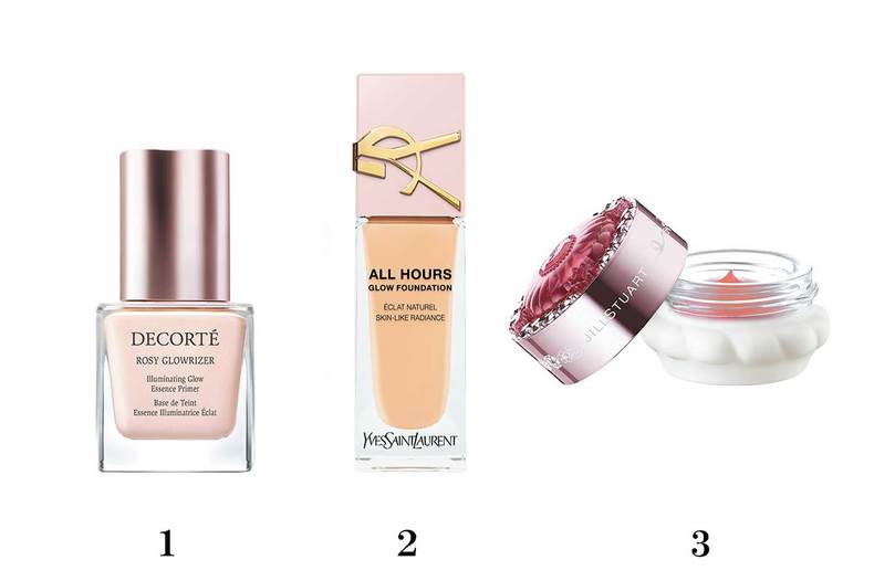 POINT2.ベースにツヤのあるリキッドやクッションを使って、パウダーのハイライトやチークでバランスをとるのが旬。