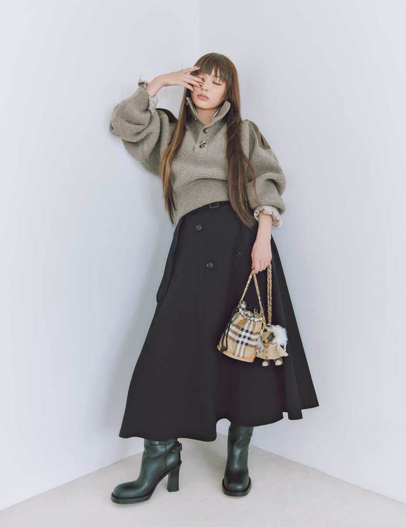 内田理央。ar11月号より ニット¥275,000、シャツ¥96,800、スカート¥220,000、バッグ¥129,800、ベアチャーム¥66,000、ブーツ¥319,000/バーバリー(バーバリー・ジャパン)