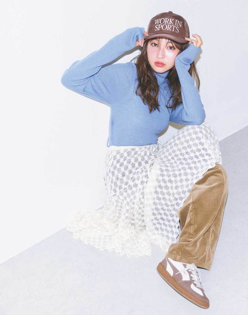 「昨日の夜、友達から突然のお誘い。気になっていた彼も来るって聞いて朝からソワソワ…。この前スニーカーをほめてもらったから、今日もスニーカーコーデにしてみたよ。 ブラウン×ブルーの配色で、この前彼と出会った日のコーデをオマージュ(笑)。このレーススカート、コーデュロイパンツと重ねても可愛いって発見♥ 今日もスニーカーをほめてくれると思ったら、アパレルブランドの営業さんなんだって! スニーカーが好きみたい。」