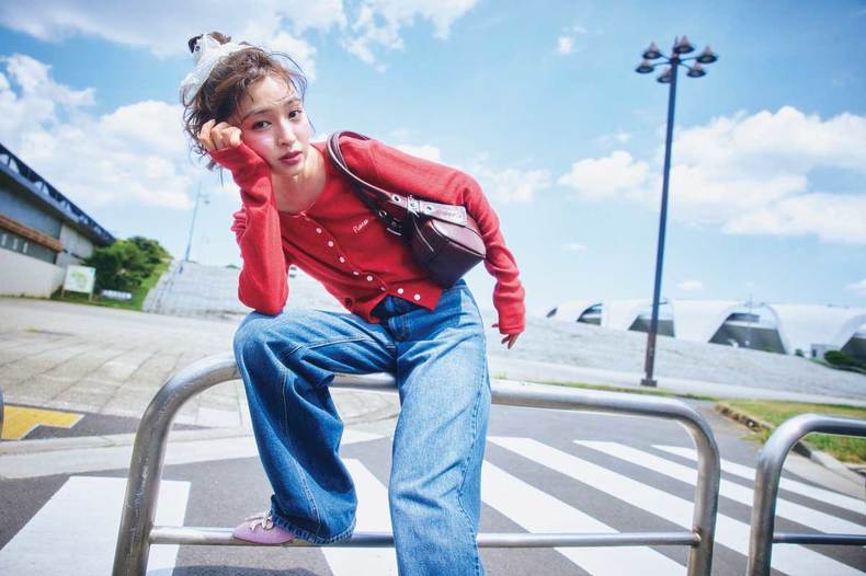「たまには失敗する時もある。わかっていても、しゅん…な気持ちは、真っ赤で明るいNEWなカーデで払拭だっ! デニムと合わせて、ストレスフリーなコーデに。パリっぽいコンパクトカーデとデニムの合わせには、甘いピンクのシューズと大きなシュシュで可愛さをブースト。気持ちを切り替えて、テンション上げてくぞ!」
