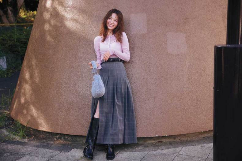 「「素敵なコーデだったので…」って突然話しかけられてびっくり! 今日のポイントは、シャツとロングプリーツの正統派コーデにニット素材やピンク、スリットなどのデザインで今っぽさを加えたところ♥ グレー×ピンクは相性よし♪ブーツにベルトと、黒のレザー小物で辛さを少し足すと、ほっこり見えをカバーできる。」