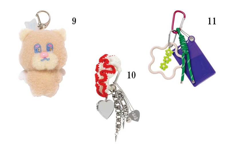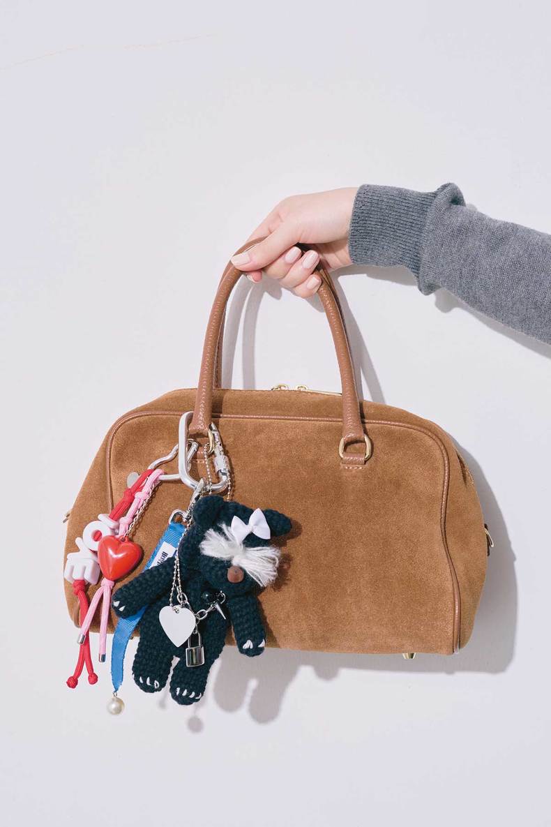 10.秋にぴったりのニット素材など、複数のチャームがジャラッとMIX。これひとつでバッグコーデがキマって便利。
