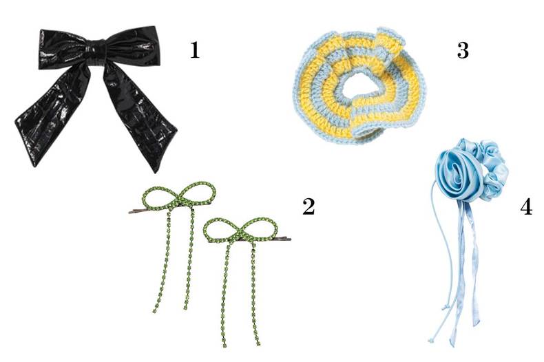1.バレッタ¥5,280/シスタージェーン(ザ・ウォール ショールーム 2.ヘアピン(2本セット) ¥13,200/イエロースワロー(ショールーム シャルメール) 3.シュシュ¥1,490/ティニーティニー(アダストリア カスタマーサービス) 4.シュシュ¥2,090/アネモネ(サンポークリエイト)