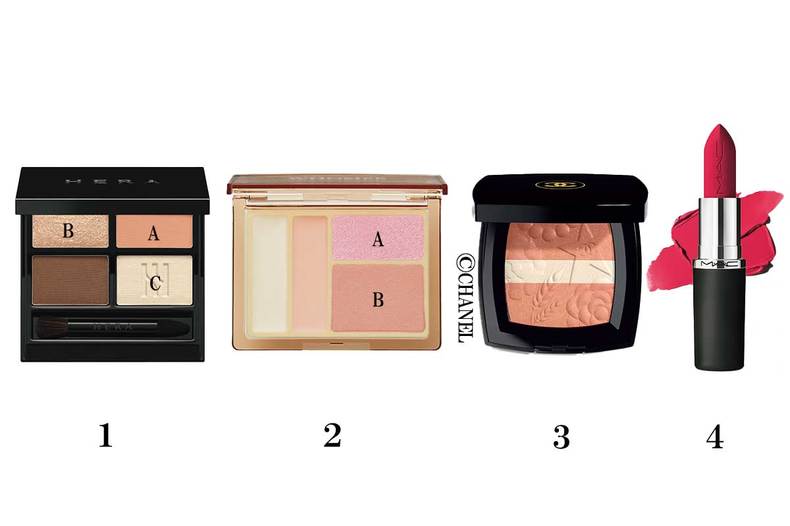その下に重ねたコーラルが肌に自然な陰影を落とし、さらに外側に三角形に添えたオレンジが、顔の輪郭をさりげなく引き締める。