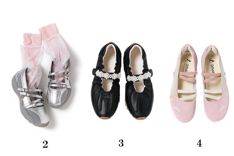 2.シルバーのスニーカーバレエには、チュールとピンクのソックスを重ねたレイヤードスタイルを提案。