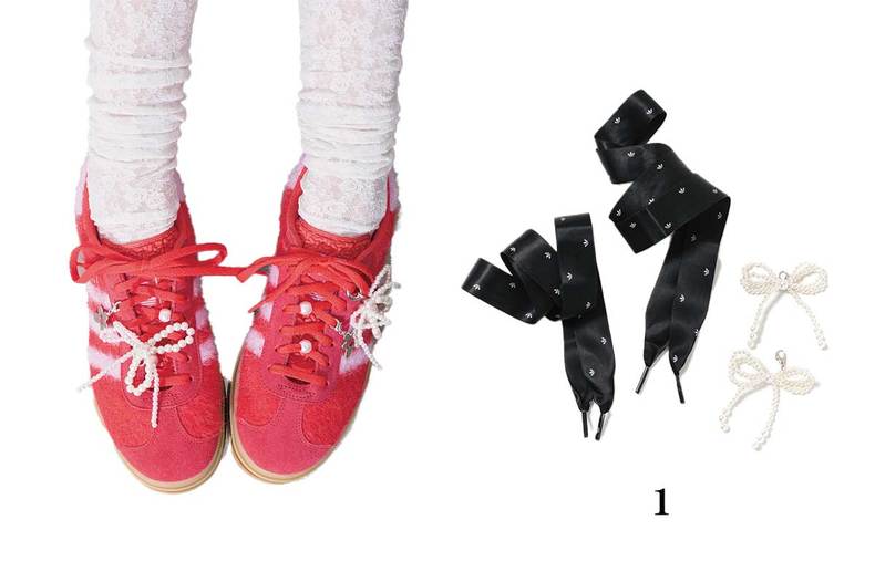 1.キラキラ付きのシューレースとリボンチャームのセット。テクいらずでスニーカーをアプデ。