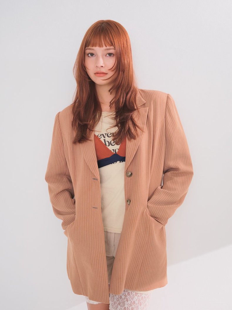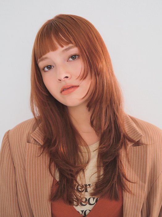爽やかだけど明るすぎないオレンジベージュは、肌ツヤがよく見えて、自然体なヘルシーさを感じさせるカラー。パツンとした前髪のラインの重さと顔まわりのレイヤーを効かせて、絶妙な軽さと重さのバランスをキープ。ジャケットなど、落ち着きのあるトラッドなファッションとも相性抜群。