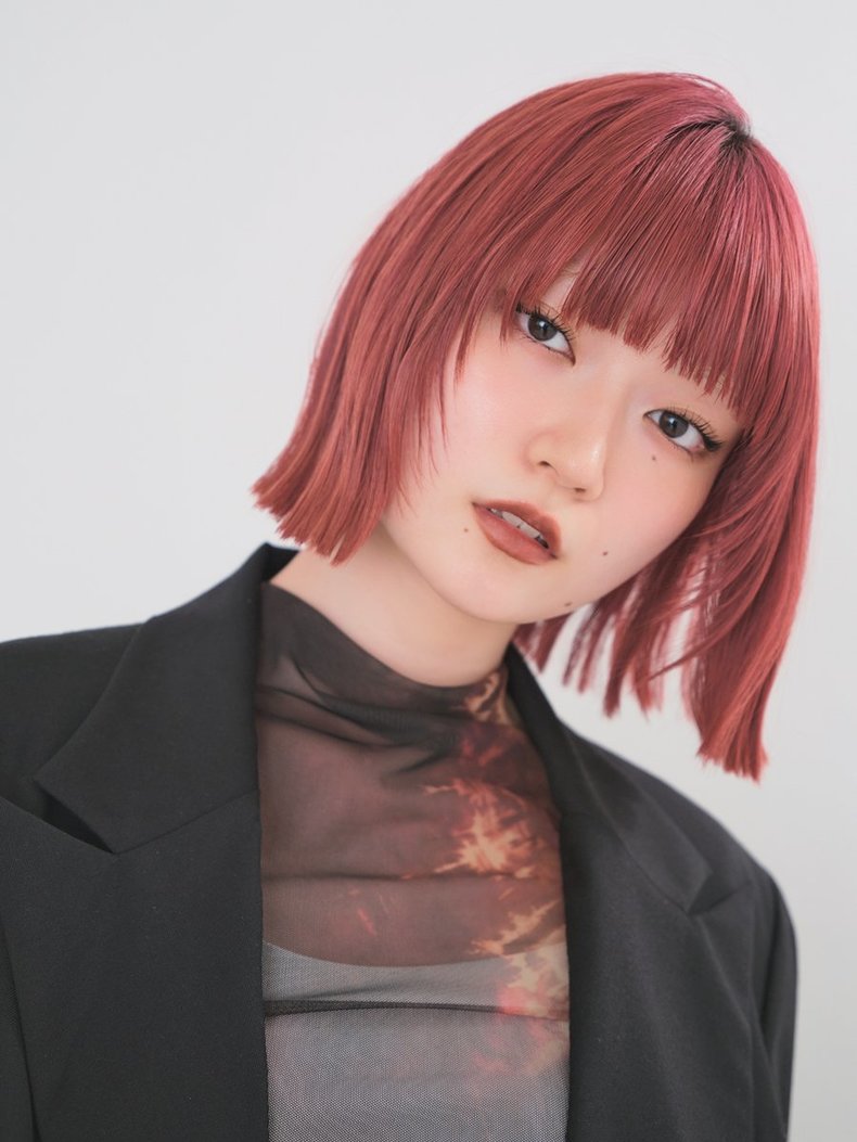 高発色だけどきちんと深みも感じさせる大人なレッドカラーに、視線も心も奪われまくり! やや強さのある色だからこそ、ヘアはシンプルな切りっぱボブでほどよく引き算して、ぐっとしゃれた印象に。アルカリカラーを使用してワンメイクでカラーすることで落ち着いた雰囲気に仕上がる。