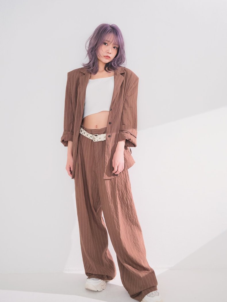 カラーでスパイシーに。ただし、主張が強いシルバーやアッシュではクールになりすぎてしまうので、ちょっぴり深みのあるカラーでまろやかさをプラス。ブリーチ2回後、全体にワンメイクで青みのあるラベンダーアッシュをオン。髪も肌もツヤピカに!