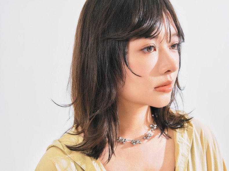 髪・メイク・ファッションが三位一体で醸し出す品のある大人っぽさが秀逸。肌なじみのよいオリーブアッシュは、赤みを抑えつつ、透明感とまろみ感を出すために少しブルーをプラス。顔まわりのレイヤーをゆるく動かして抜け感を出し、印象をさらに柔らかく。