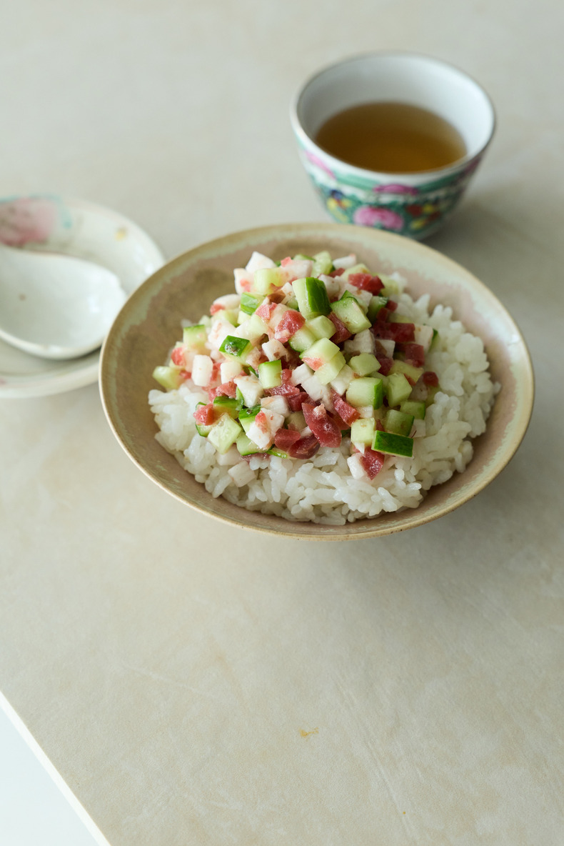 レシピ① カリカリ梅と長いも、きゅうりのさっぱりソースかけごはん