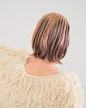 目横付近から切り込んだマッシュボブは、色のミックス感が際立つようにデザイン。ハイライトには2回ブリーチ後にチョコレート系のピンクミルクティー、ローライトには深みのあるラベンダーアッシュを。ブリーチとローライトをサンドイッチするように入れて、こなれた印象に。