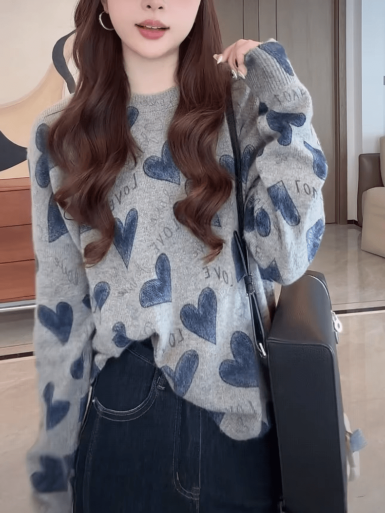 アイテム①ハートプリントのラウンドネック長袖ニットセーター【カジュアルでしたスタイル】