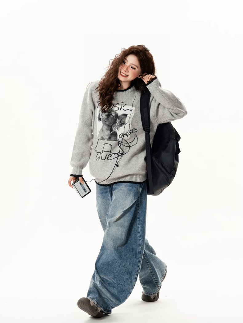 シンプルなニットでは物足りない人に、こちらのグラフィックニットをレコメンド。眠たそうな表情が愛らしい子犬のモチーフと、周囲にはヴィンテージライクなペイントが施されています。
