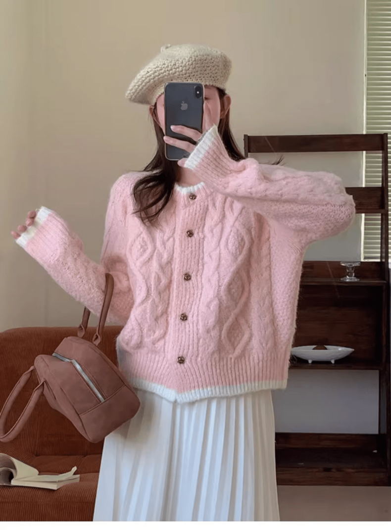 ざっくりとしたケーブルニットのカーディガン。ミルキーなピンクがほどよい甘さを醸し出します。1枚でトップスとして着るのはもちろん、前ボタンを開けてカーディガンとしても超使えるすぐれもの。