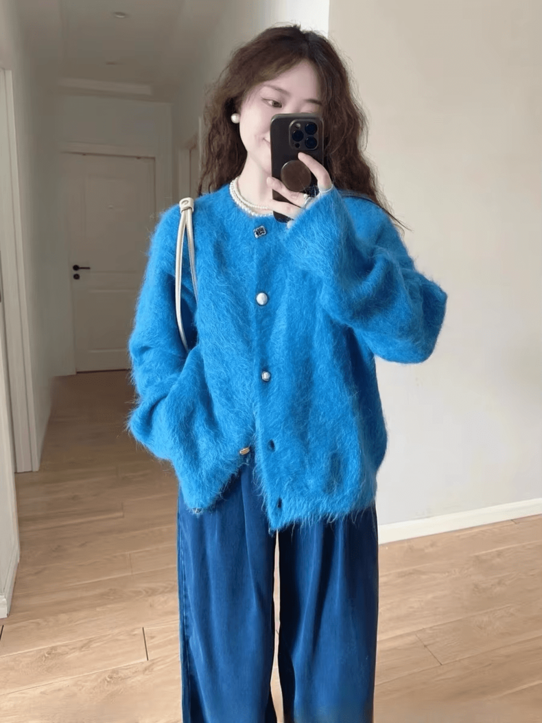 アイテム③青色のフェイクミンクニットカーディガン【秋冬用・極上の柔らかさ・カジュアルスタイル】