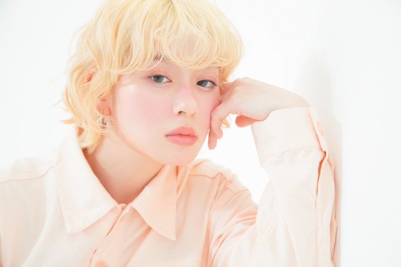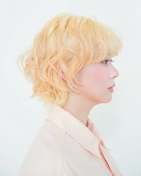 にごりのない金髪と天パのようなナチュラルなカーリー感がおしゃれ。リップラインのボブをベースに、毛先がカジュアルに動くように顔まわりにはレイヤーを。ブリーチ抜きっぱなしの金髪は、肌の血色感が際立つ色味だからメイクや服をピンクで揃えて、多幸感たっぷりに♡