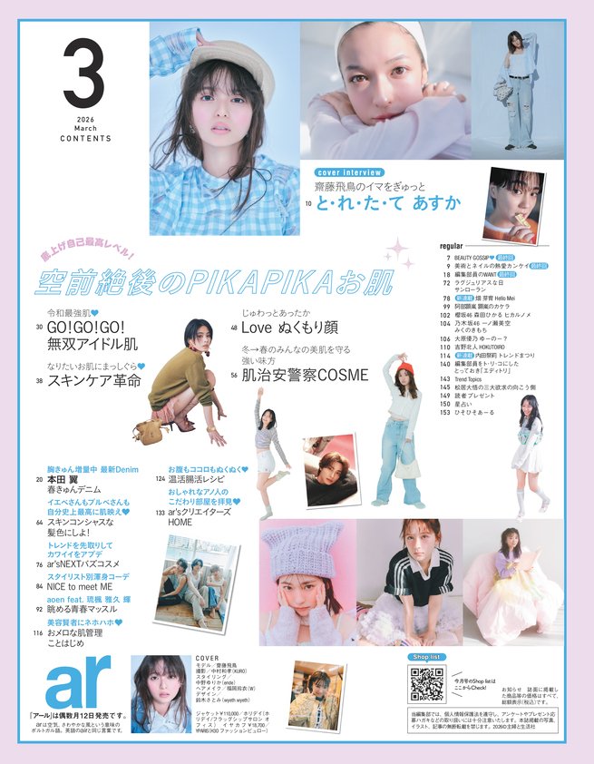 MAGAZINE 公開日 2026.2.12 / 更新日 2026.2.12 AUTHORarweb編集部 ar3月号 SHARE ar3月号カバーは齋藤飛鳥さん♡ 特集は、”空前絶後のPIKAPIKAお肌”スキンケア号! 購入はこちら