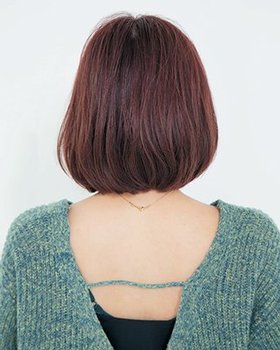 洗いざらしでもおしゃれにキマるのは、トップからレイヤーを入れて、自然な動きや毛流れをつくっているから。平凡なボブにならないよう、前髪を長め&薄めにカットして、目をチラリと覗かせるややうざめバング仕立てに。肌色のトーンを爆上げしてくれるレッドパープルのカラーを合わせて、行きすぎない甘さもさりげなくオン!