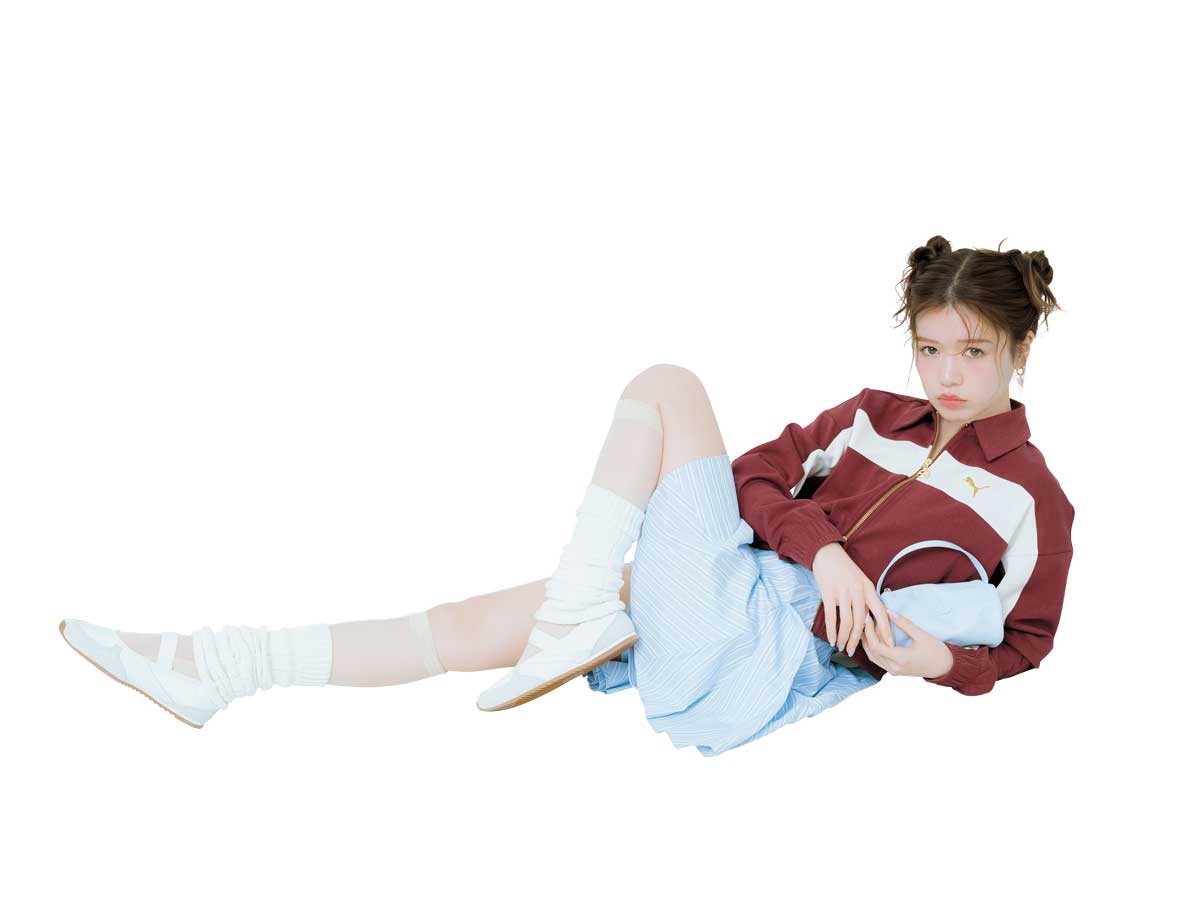 トップスにスポーツジャケットを仕込んだら、足元はシアー×ルーズのソックスをレイヤーしてシャレみを出しつつ、スポーティなバレエシューズでトンマナを調整。スカートとバッグの色味を揃えることで、コーデ全体の統一感もUP」(スタイリスト今村仁美さん)