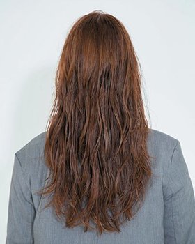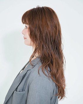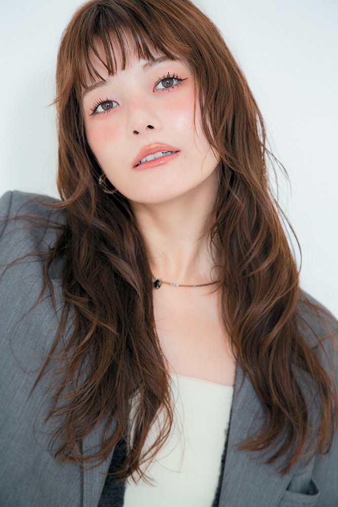 ヘルシー感や可愛さ、女らしさだけじゃない、凛とした印象の胸下ロングで、ヒーロー的なクールな存在感に。顔まわりには独立したレイヤーを入れてシャギーっぽい動きを出し、前髪はオン眉にカット。根元から大きめのロッドでミックススパイラル巻きにしてボリュームを出せば、抜け感のある洒落っ気たっぷりな立体ロングに。