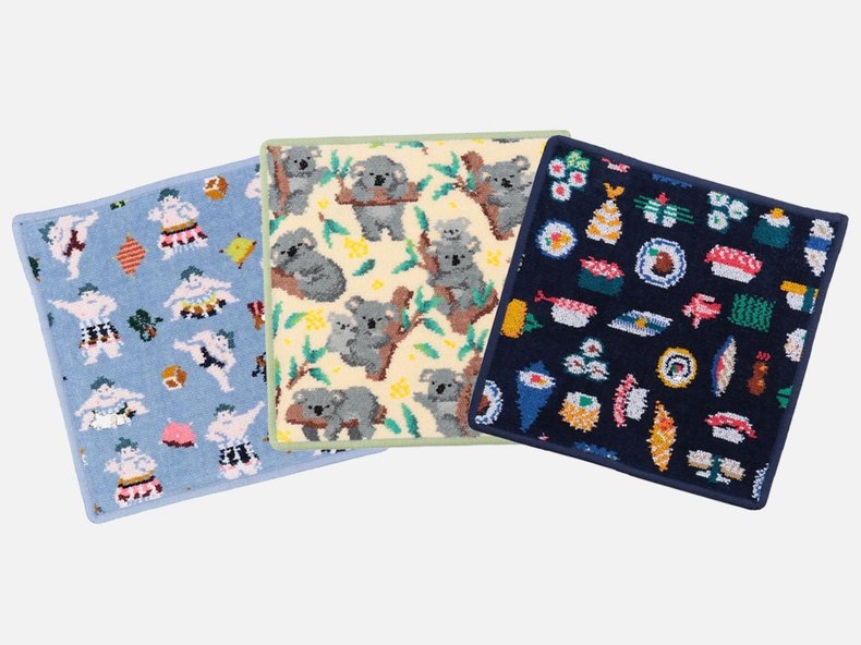 表裏どちらも鮮やかな発色を楽しめるシュニール織は、優しい肌触りで吸水性も抜群。コアラやお寿司、お相撲さんなど、つい集めたくなるキャッチーなデザインも魅力。