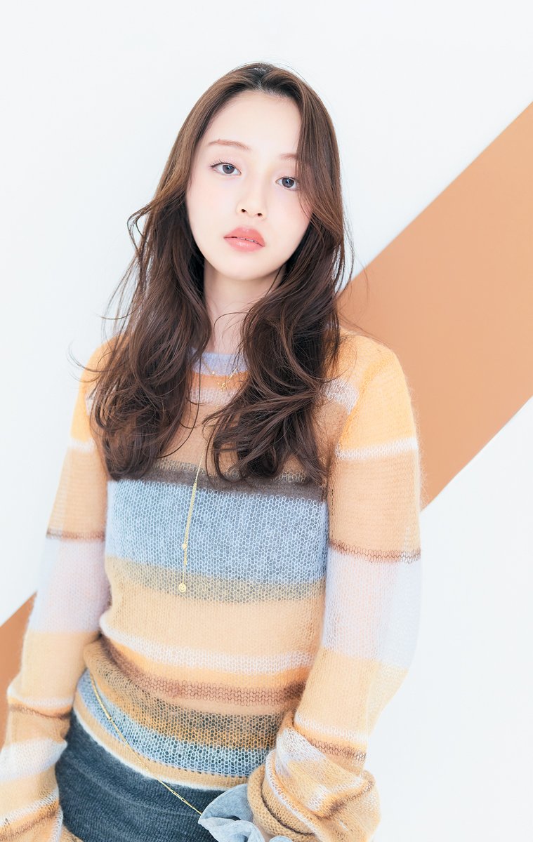 ほんのり感じるピンクみがイエベの肌をパッと明るくして、透明感爆誕! さらにグレーもプラスしてフォギーなツヤ感を演出したベージュ風のブラウンカラー。合わせたのはふわふわのロング。顔まわりに入れたレイヤーと、長めの前髪からのつながりでアンニュイな動きをつければ色っぽさも楽しめそう。