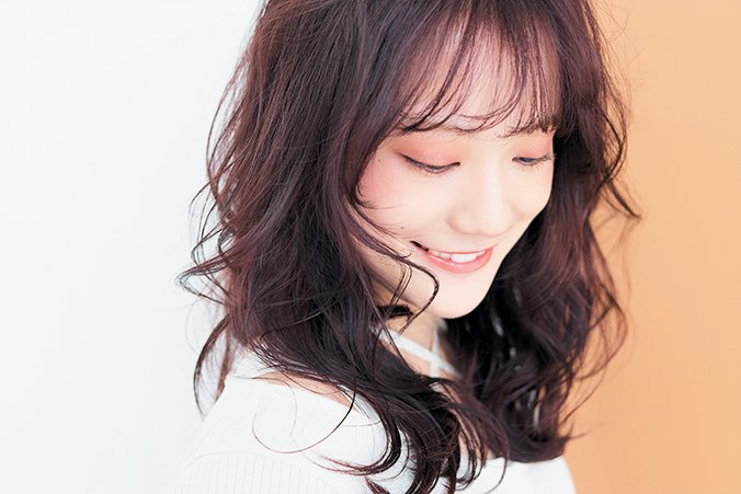 イエベ肌に自然になじむブラウンをベースに、クリアなピンクを加えて発色をコントロール。甘さと落ち着きを両立した、大人フェミニンな雰囲気を演出。重さを残しつつ、シースルーバングやレイヤーで軽やかさを添えたバスト上のふわカールロングを合わせ、トレンドを盛り込んで。