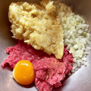 ②挽肉を塩でこね、①のじゃがいも・(A)と一緒によくこねる。