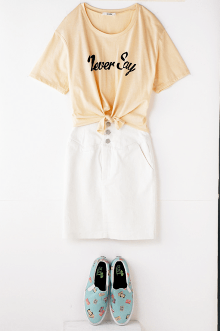 ウエストがキュッと見える裾縛りTだけど、チラッと見えるお腹も恐怖だったり…。そんなあなたはハイウエストのボトムを合わせるべし。出したくないところは隠しつつウエストシェイプ効果も抜群。白デニムのスカートは、厚手で頼もしいものを選ぶとよりグー。Tシャツ¥4,600/スナイデル スカート¥6,900/ミーア ニット帽¥2,500/ボニカスタジオ(スタイルフェスタ) スニーカー¥11,0