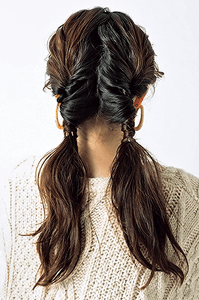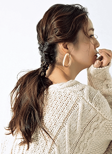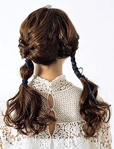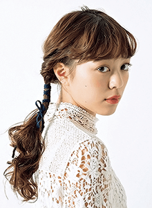 全体を26㎜のアイロンでミックス巻きにする。全体の毛束を左右にアシメに分けて、それぞれ耳裏でくるりんぱを。片側のみ、その下にもくるりんぱをつくり、逆側はベロアのリボンを巻きつけて結ぶ。耳を隠すようにくるりんぱをつくるのがルーズに仕上がるコツ。