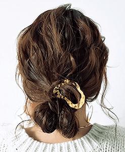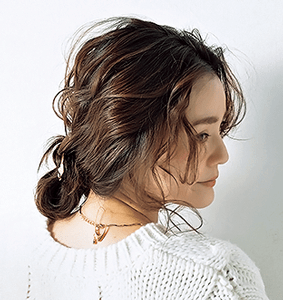 もみあげと表面の髪を32㎜のアイロンで波巻きにする。前髪は少し立ち上げるようにふわっとさせると色っぽい。バックの低い位置でひとつにまとめて、毛束を内側に半分に折っておだんごにする。毛束を引き出して、ゆるっと仕上げるとアンニュイ感が増し増しに。モデル/藤井明子(argirl)
