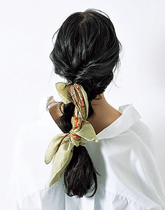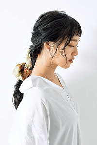 ハチ上の髪を取り、バックの中央でくるりんぱをつくる。くるりんぱの穴の中にスカーフを通して、残りの毛束と一緒に三つ編みにしたら、毛先をゴムで結ぶ。最後にゴムを隠すようにスカーフを結べば完成。顔まわりのおくれ毛は多めに引き出して、ルーズな外ハネに巻いて。モデル/阿島ゆめ(argirl)