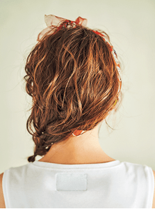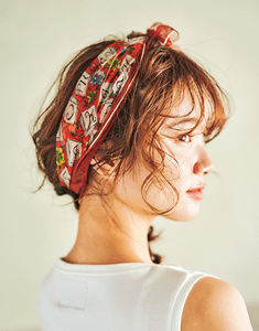 19㎜のアイロンで表面と前髪を内外にしっかり巻いて、ワックスでくしゃっと崩します。特に顔まわりを思いっきりふわふわに巻いておくのが、可愛く仕上げるコツ。襟足にスカーフを通してトップで結び、左サイドへ毛束を寄せてゆるっと三つ編みに。毛先を輪っか結びにして、編み目をほぐします。最初にしっかり巻いておけば、三つ編みはラフでOK。