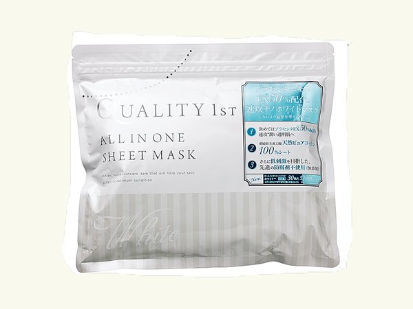 完全防腐剤無添加も◎。美白有効成分50%で、 顔後マスク1枚で透 明感も潤いも極上に。クオリティファースト オールインワンシート マスク ホワイト 30枚入り ¥1,900