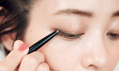次にbのアイライナーを上のインサイドに仕込む。ブラックやブラウンではなく、あえてグレイッシュなアイライナーを選んで抜け感をアップさせて。