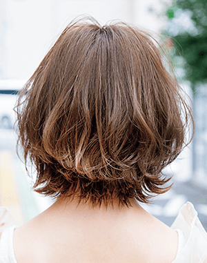 甘い表情にスリークな毛流れのヘルシーショートが愛嬌を底上げ。さらにくびれたシルエットで女らしい曲線も欲張って全方位から愛されるスタイルに。少しパープルを足したミルクティーベージュカラーは、黄みを抑えて外国人のような透明感にあふれたカラーを実現。