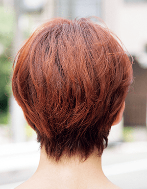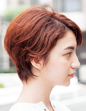 クールなのに女らしさもあるマッシュショートは、襟足などポイントで長さを残してニュアンスを出しているから。カラーは9トーンのオレンジでツヤと秋冬らしいジューシーさを欲張って。バングは丸みをつけてサイドに流して涼しげに、耳上と襟足はキュッとタイトに抑えて完成。