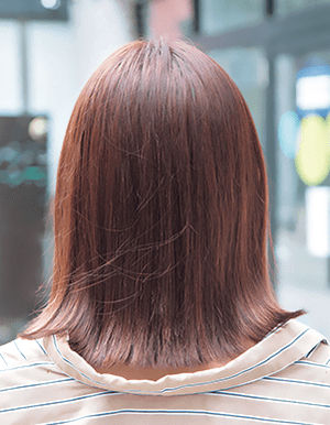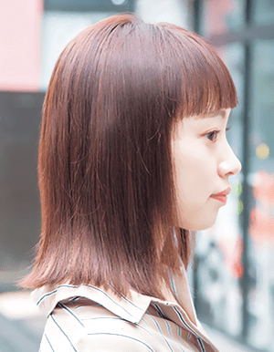 ワイドバングでラインを強調したストレートのロブは、パサつきをカバーしながらのばしていきたい人におすすめ。手ぐしで毛先を外へ反らしながら乾かし、ストンと落ちるような毛流れに整えて面のツヤを際立てる。カラーはコッパー+メープルのクリーミィな暖色系をチョイス。