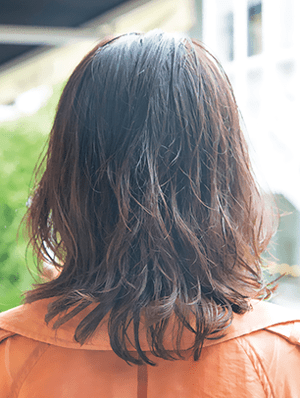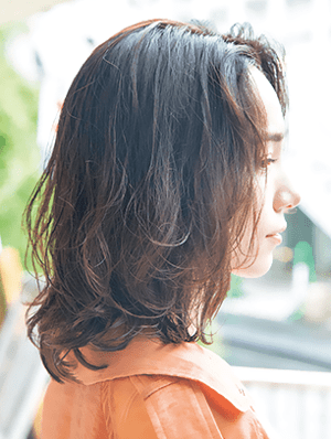 あえてパツンとブラントな段を入れて、コンサバになりがちな長さをおしゃれモードにスイッチ。さらにハネやすい長さを生かして、毛先のみワンカールパーマをかければ、仕上げは乾かすだけで決まっちゃう。ハンドドライ後、軽めのワックスをなじませて。カラーはカーキアッシュを。