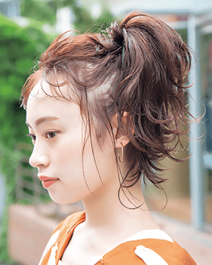 ウエットなスタイリングの状態で毛束をトップに集めて、左サイド寄りでポニーテールに結ぶ。外ハネにした毛先がバラバラ散ってくれるから、結ぶだけで完成! 落ちた毛束はそのまま後れ毛としてキマるのも、アレンジ下手には嬉しい限り。 襟足の後れ毛は見せピンで留めると、おしゃれ感が上がりマス♥