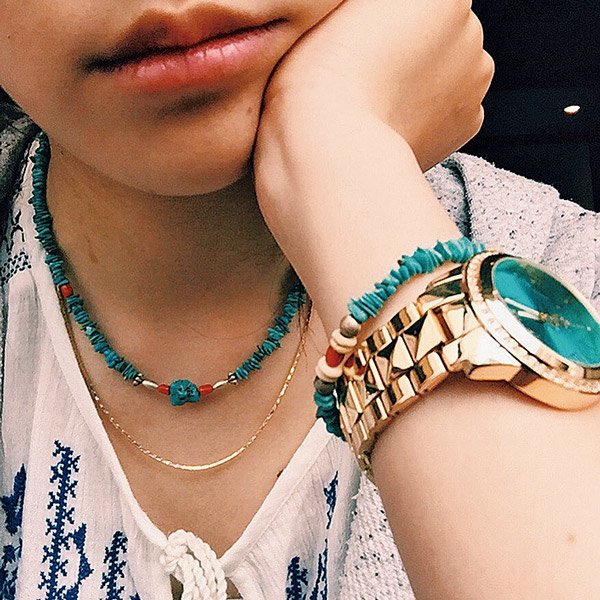 今ハマっているもののひとつがターコイズアクセ。ひとつ持っているだけでトレンドを取り入れられるし、キメすぎないヘルシー感が出せるのがツボです。表参道周辺のインディアンジュエリーのショップに通うほどのハマりっぷり(笑)。ターコイズは幸運をもたらす石とも言われているので、つけているだけでお守り効果があるというのも女子的に嬉しいポイント 確かに身につけ始めてから、毎日ハッピーな気が…!? プチプラシ