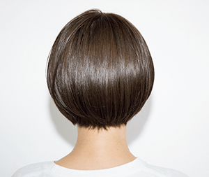 襟足からグラデーションにカットして収まりをよくしたら、耳にかけてよりタイトに。眉上1cmのパッツンバングでエッジを効かせておしゃ感をアップ。オイルミルクを全体になじませたら、前髪はちょい足しして束感を整える。