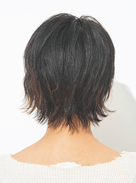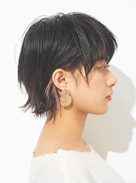ハイライトを効かせたナチュラルブラックの髪色や、ザクッとした前髪のラインが辛口なウルフショートが最高にオシャレ。長短は控えめに、襟足の量感を軽くしすぎないのが、やりすぎないJUSTなウルフに仕上げるポイント。パサつきがちな毛先は、外ハネに握りながらちょっぴりウエットにスタイリングすることで、上品モードな印象をキープ。