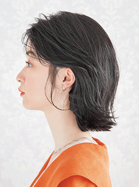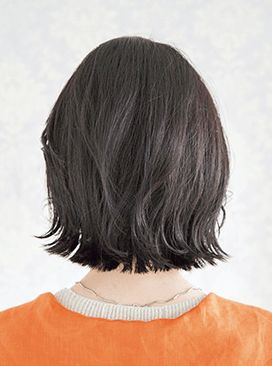 のばし途中の前髪をなんとかしたいという要望を叶えるのが、オールバックのおしゃれボブ。少しグラデーションを入れて重めにカットし、鼻ラインで前髪を薄めにつくる。 直毛の場合には毛先に半カール、前髪ともみあげは根元まで巻き込んでクセ毛風の動きをつける。オールバックにスタイリングして無造作に。