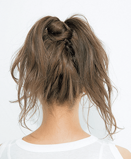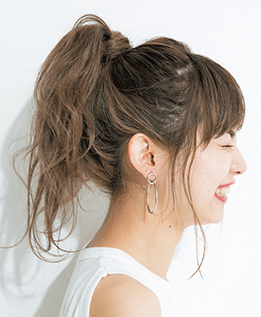 耳まわりのハイライトの透け感を生かすなら、あえて毛束を2つに分けた個性的なポニーで。 表面はあまり巻かずにオイルでツヤっぽく。内側はコテでウエーブ状にゆるく巻いて、ドライな状態に仕上げると透け感が映える!
