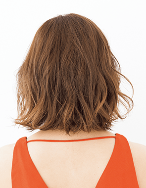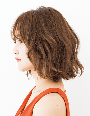甘さを控えたこなれ度高めなふわ重ボブ。 水平ボブの表面にレイヤーを入れて動きをつけ、内側は外ハネをスタートにした波巻き、表面は顔まわりをフォワードにしたミックス巻き。 巻いたあとに、細かく細い束で巻き足すとふわふわ感がマシマシに。 表面にハイライトを入れた立体カラーも効果的!