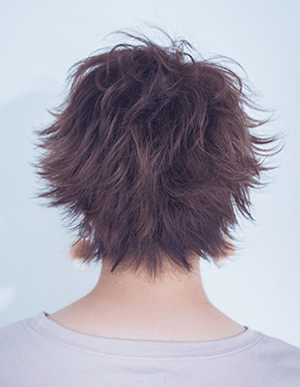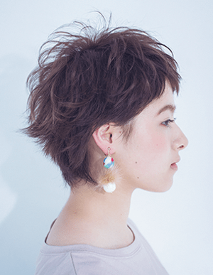 ウルフらしい長短をつけながら、丸みのラインがキュートなショート。甘さをキープするポイントは、耳後ろに長さを残して、襟足は短めに切ること。直毛は毛先がラフに動くようにパーマをかけて。透明感たっぷりのアッシュベージュのカラーで柔らかさをプラス。