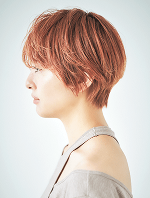 あえて前髪は長め&薄めに設定して、ほのかな色っぽさをイン。 透明感が隠しきれない軽やかショートで抜け感をそっとアピール。 丸くなりすぎないよう毛先はランダムに内、外にハネさせて。 顔をパッと明るく見せるオレンジベージュでハッピーオーラも充満♡