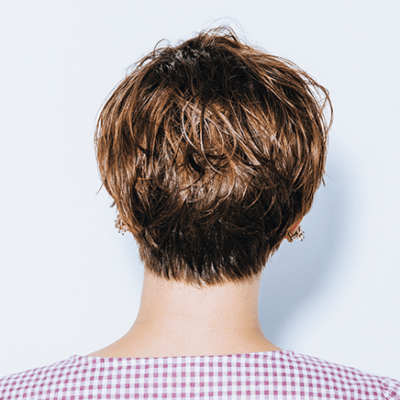 左右の耳から耳までゴールドのアメピンを×に留めて、切りっぱなしのラインを生かした外ハネアレンジに。ベースは26㎜アイロンで毛先を外巻きにワンカール。オイルとワックスを混ぜて手ぐしでなじませ、たっぷりとツヤを与え、ピンをあしらう。